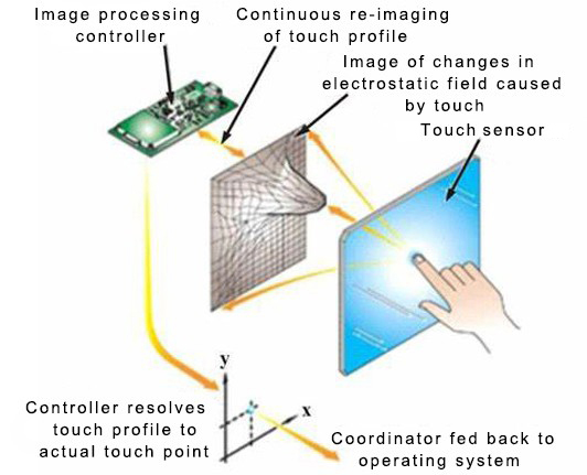 The metal grid capacitive screen works the same as the ITO capacitive screen, and different conductive circuit modules are etched on the two layers of conductive material coatings. The patterns etched on the two modules are perpendicular to each other, and they can be regarded as sliders that change continuously in the X and Y directions. Since the X and Y structures are on different surfaces, a capacitive node is formed at the intersection. One slider can be used as the drive line, and the other slider can be used as the detection line. When the current passes through one wire in the driving line, if there is a signal of capacitance change in the outside world, it will cause the change of the capacitance node on the other layer of wire. The change of the detected capacitance value can be measured by the electronic circuit connected to it, and then converted into a digital signal by the A/D controller to allow the computer to perform arithmetic processing to obtain the (X, Y) axis position, and then achieve the purpose of positioning.